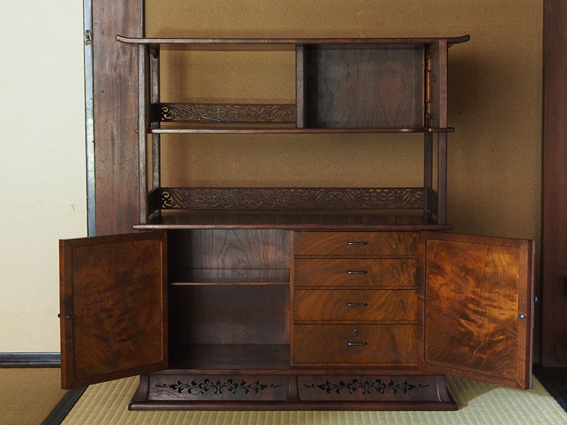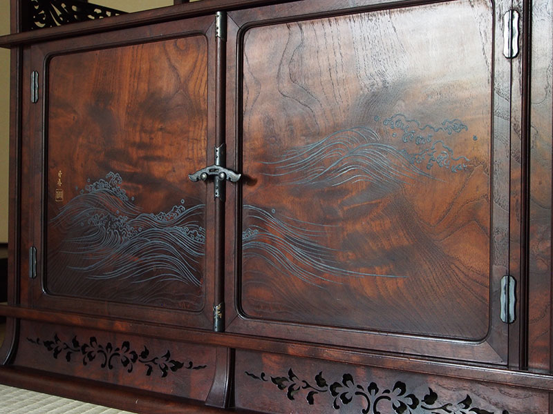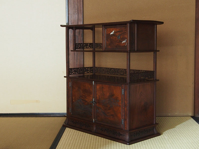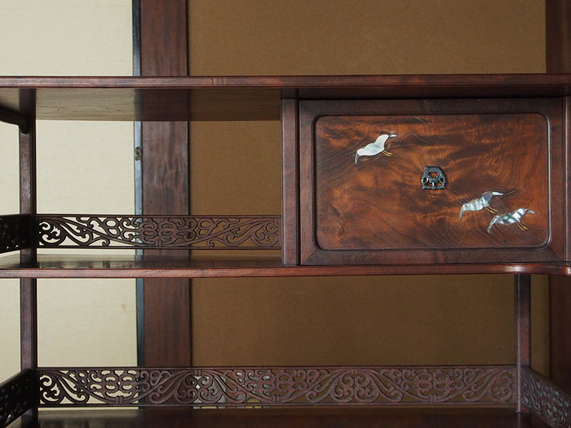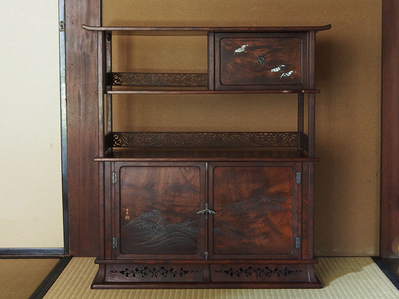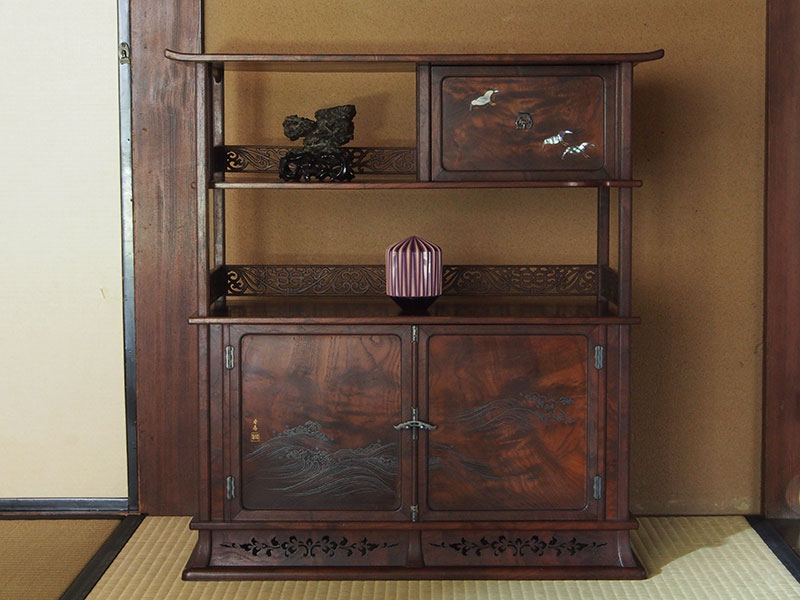 桑材を使用した飾り棚は、その木目の美しさ、木地の細かさはさることながら、各段の透かし模様、大胆な波の蒔絵も見どころです。蒔絵部分は、漆芸の名人といわれる柴田是真の三男である梅沢隆真の銘が入っています。上部の開き戸には、カモメの螺鈿が輝き、下部の開き戸の漆黒波図との対比がこの飾り棚の最大の魅力となっています。