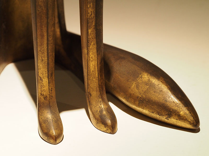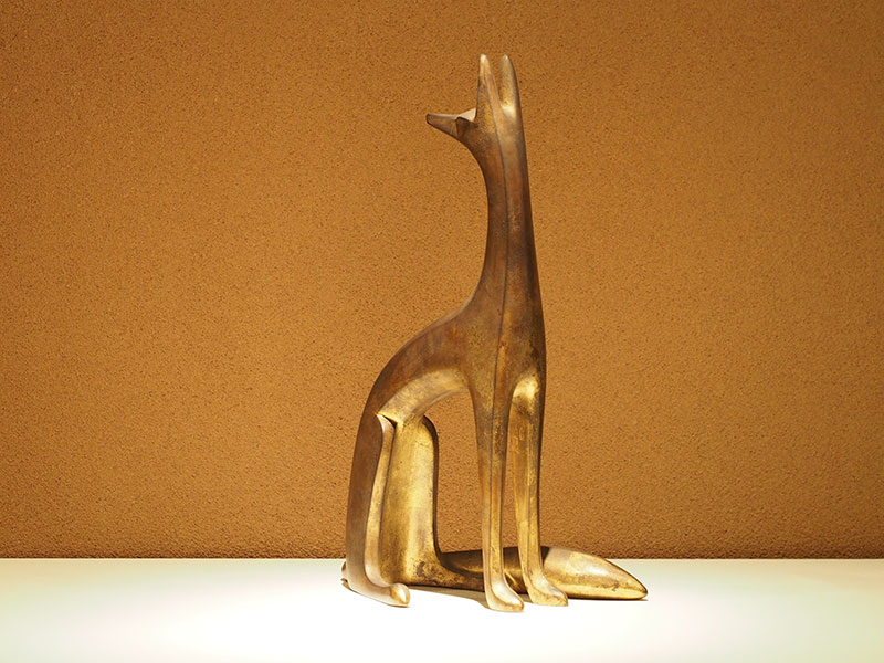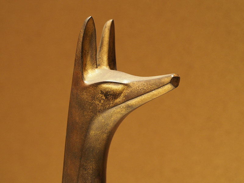できるだけ無駄な線や装飾をなくしたこの姿は、とても美しいです。実物の狐とは程遠いフォルムですが、きりっとした姿や油断のない佇まいは十分に狐らしさを持ち合わせています。ずっと眺めていても違和感を感じさせない落ち着きが魅力。金属の冷たさはあるものの柔らかな金色が優しく光を放ちます。