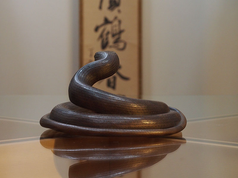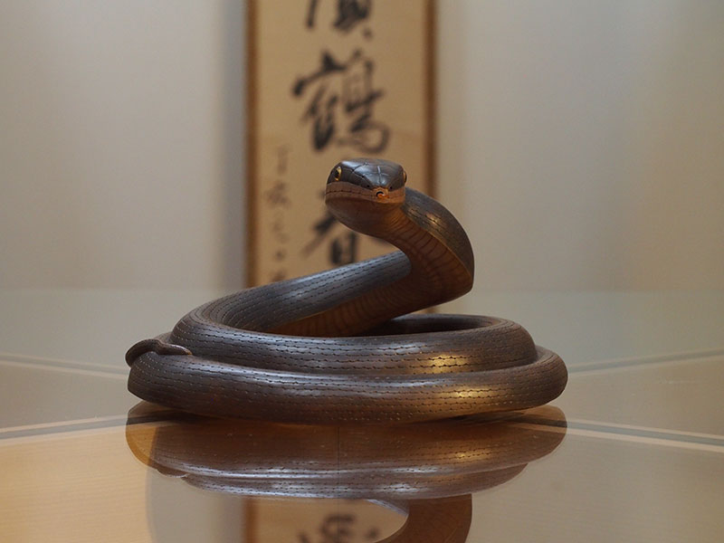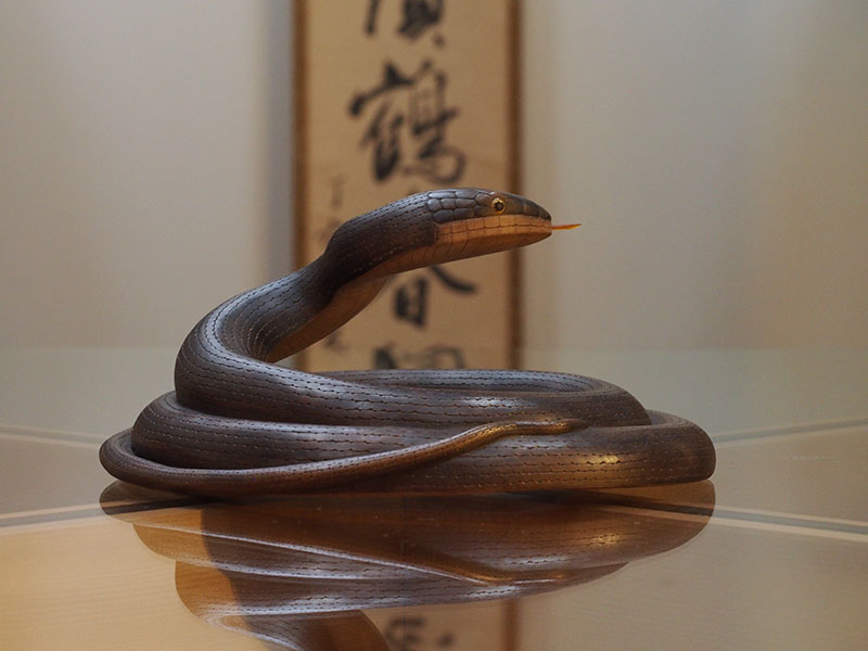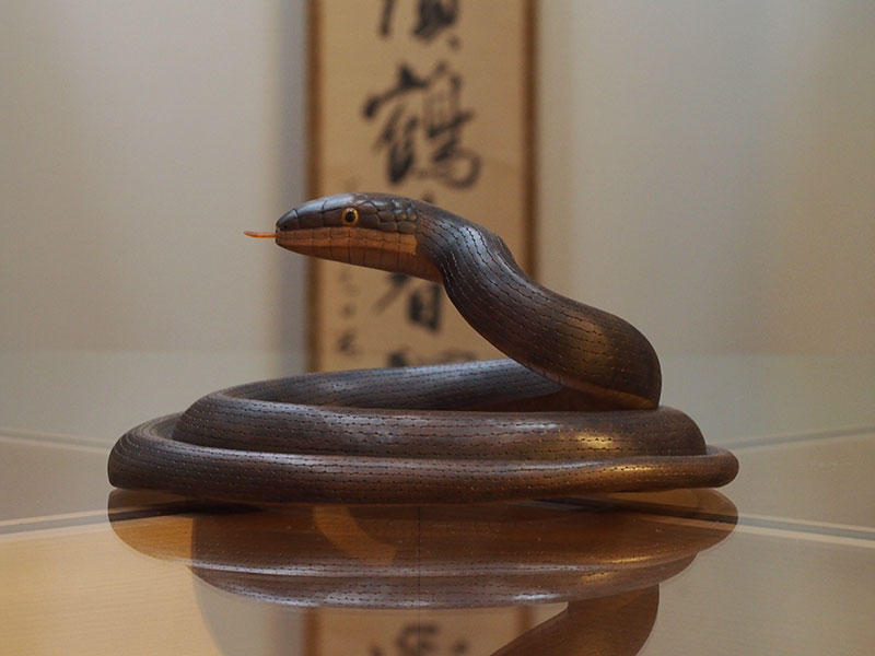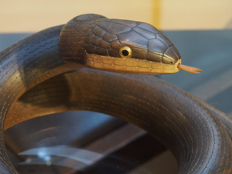 とぐろを巻き、頭をもたげるその姿は、今にも動き出しそうで感心します。張りのある胴回りからは、蛇特有の柔らかな動きが容易に想像できます。それでいて恐怖や嫌悪感はなく、愛嬌のある顔は親しみを覚えます。小さな舌先が出たり入ったりと動くように細工されているのも面白い部分です。