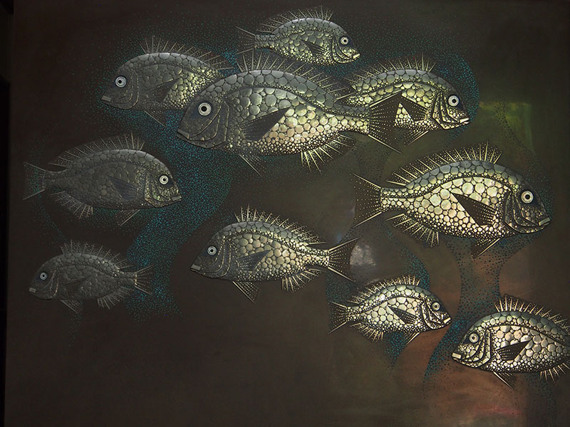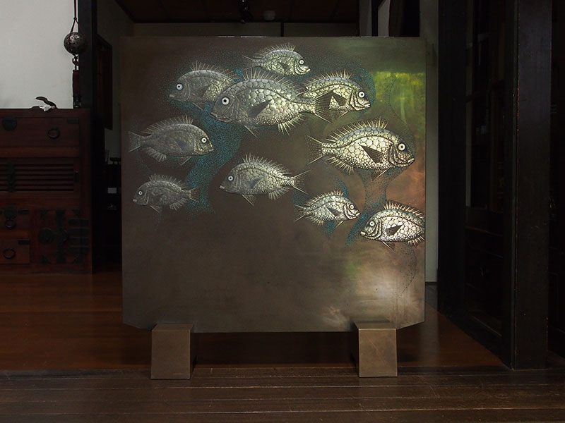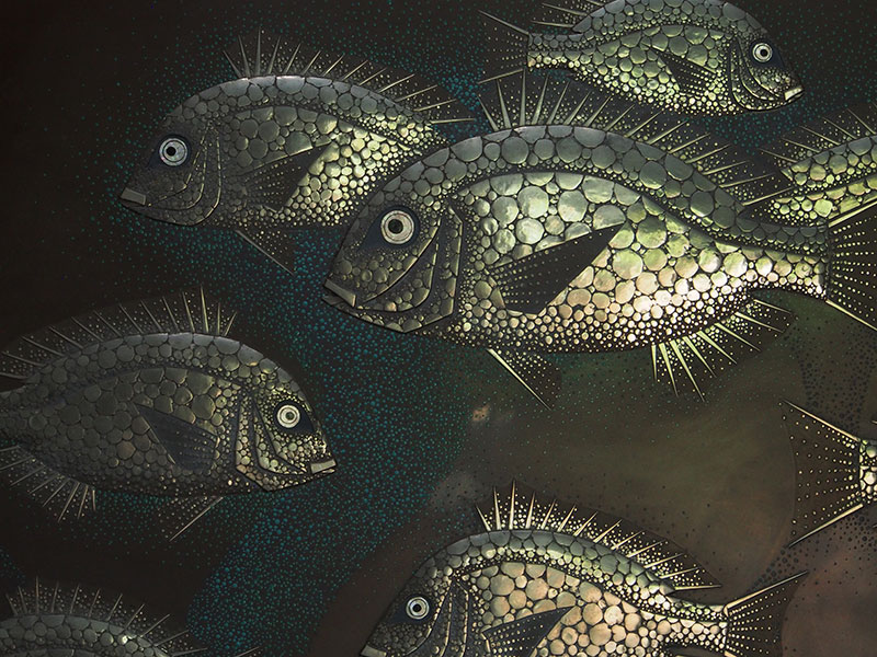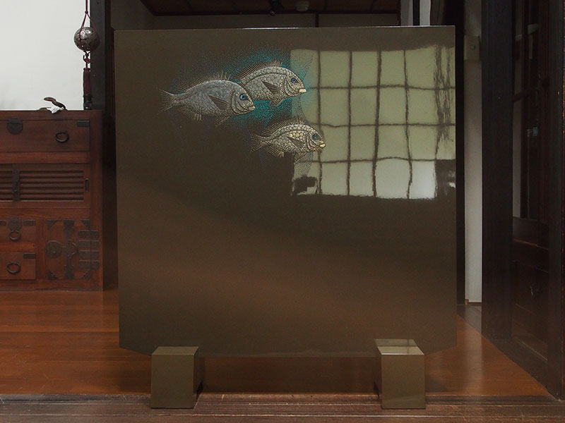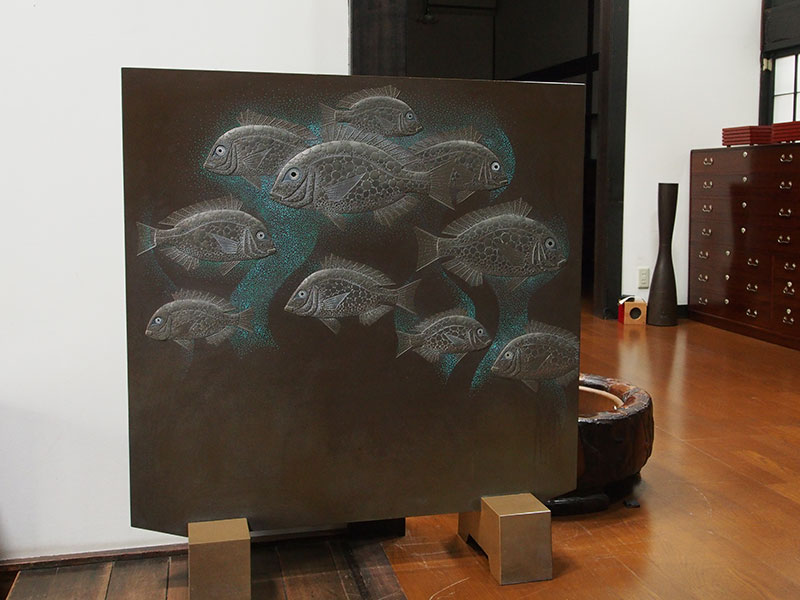 魚や蟹、海老など海の生き物をモチーフにした漆芸作品が多い尾長保、衝立になっている珍しいものです。彼の見せる魚は個性的で独特の世界観が広がります。銀色の魚群は光の反射で輝き、また見る方向によっては、まるで石のような乾いた姿にも変化します。魚が作り出す不思議な景色が見られる面白い作品です。