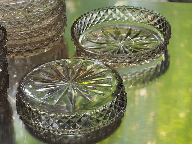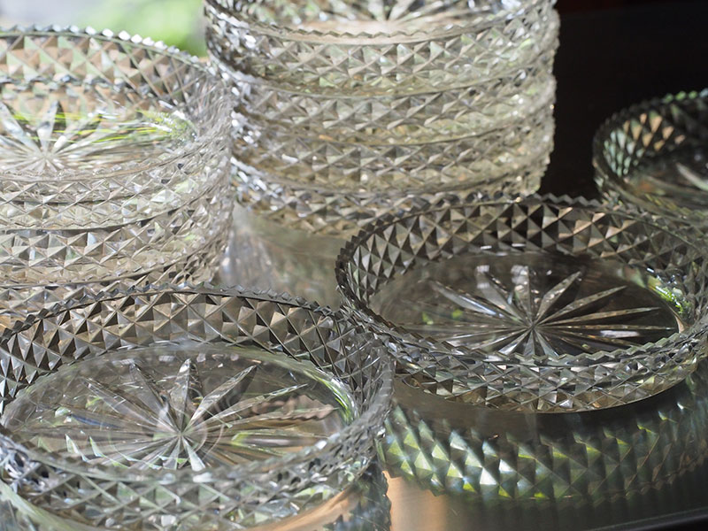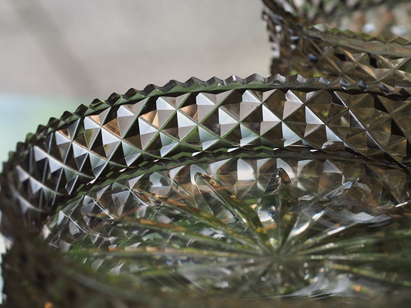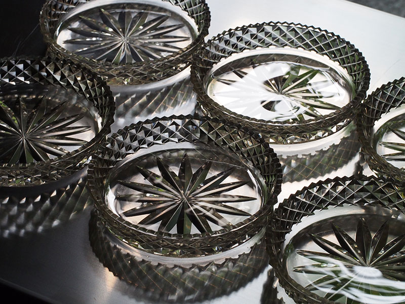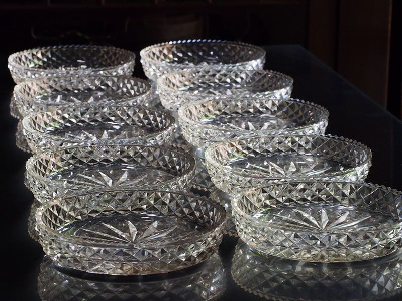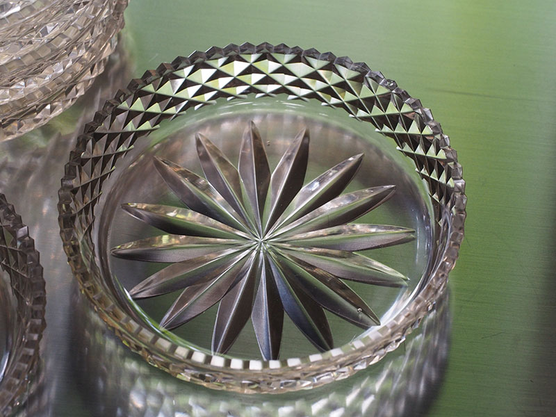 中央と側面に施された模様は切り込みが深く、輪郭がはっきりとしているので、その輝きは特別なものに感じられます。光の反射に濃淡があり小さいお皿でありながら奥行きと重厚感があります。古いガラス特有の色と独特の透明感は新しいものにはないものです。そして10枚揃いというのも大きな魅力です。一部小さな欠けがございますが、大切に扱っていただければ差支えないと思われます。