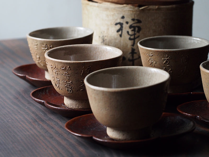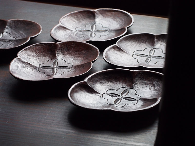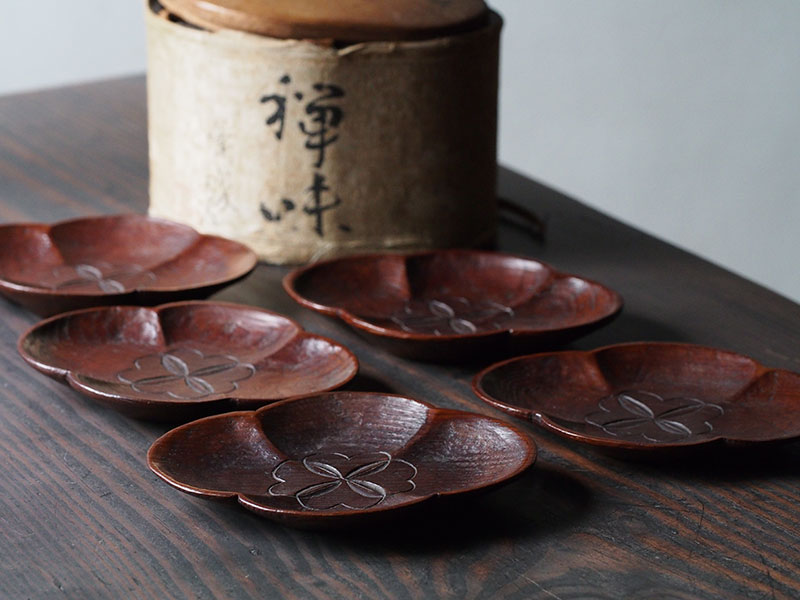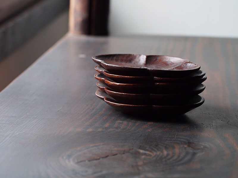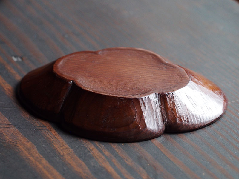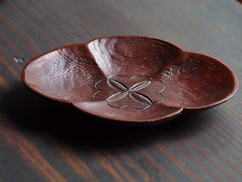 1つひとつを丁寧に彫り進める。けれどその作業は、究極の美しさを求めるのものではなく、やわらかな木肌を大切にした素朴さと優しさに溢れています。作った人の人となりが見えてくるようで、どこか懐かしく、私たちを穏やかな気持ちにさせてくれます。手に取るとその軽さに驚かされます。茶托の形に合わせて誂えられた楕円形の共箱からも、このお道具に対する想いが伝わります。